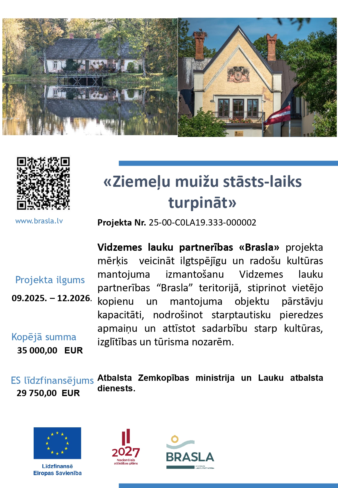 2025. gada septembrī Lauku atbalsta dienests apstiprināja Vidzemes lauku partnerības "Brasla" starpvalstu sadarbības projektu "Ziemeļu muižu stāsts- laiks turpināt", projekta Nr. 25-00-C0LA19.333-000002. Projekts tiek īstenots sadarbībā ar Somijas vietējo rīcības grupu Kehittämisyhdistys SILMU ry.
