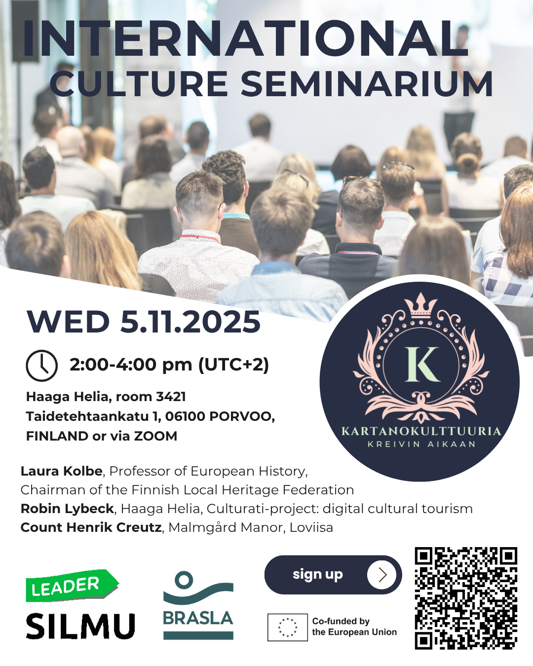 Vidzemes lauku partnerība "Brasla" sadarbībā ar Somijas vietējo rīcības grupu Kehittämisyhdistys SILMU ry, starpvalstu sadarbības projekta "Ziemeļu muižu stāsts- laiks turpināt", projekta Nr. 25-00-C0LA19.333-000002, ietvaros, aicina piedalīties starptautiskā kultūrvēstures seminārā.